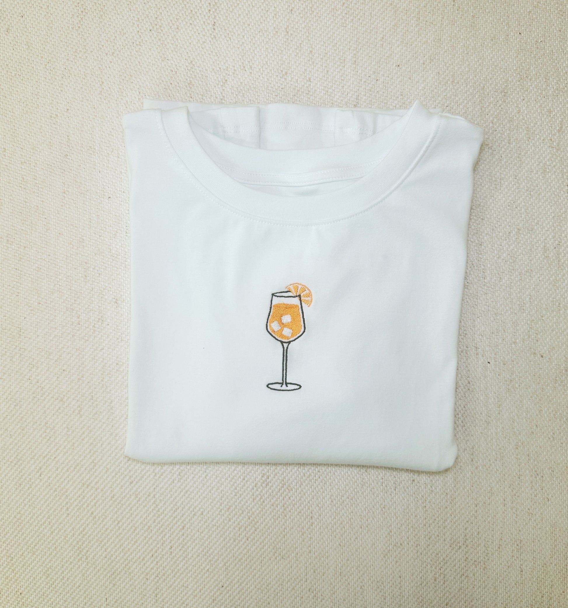 Add a splash of sunshine to your wardrobe! This soft, fitted white baby tee is cut from breathable cotton and finished with a embroidered spritz glass!