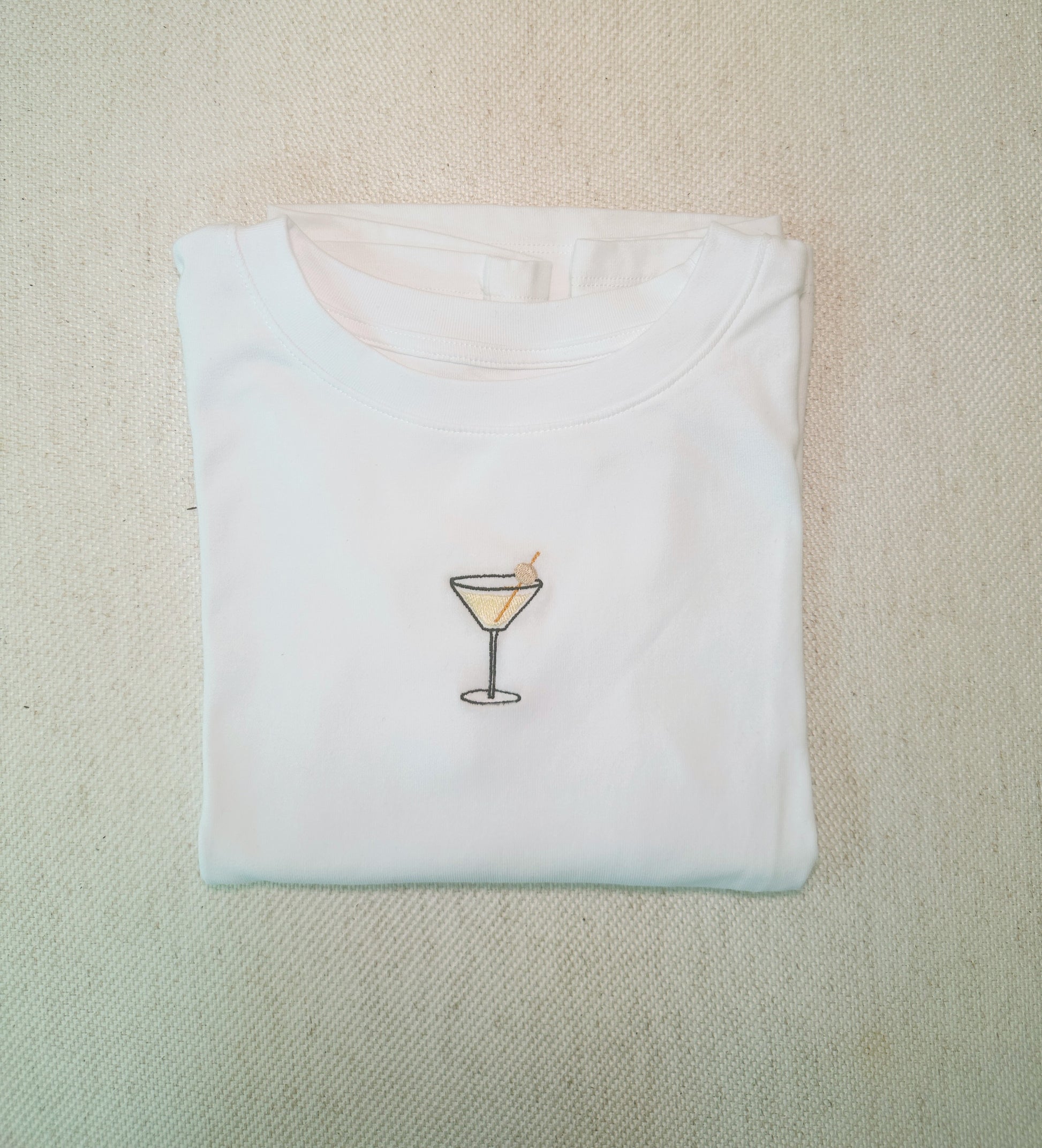Shake things up! This crisp white baby tee is topped with a flirty lychee martini embroidery!